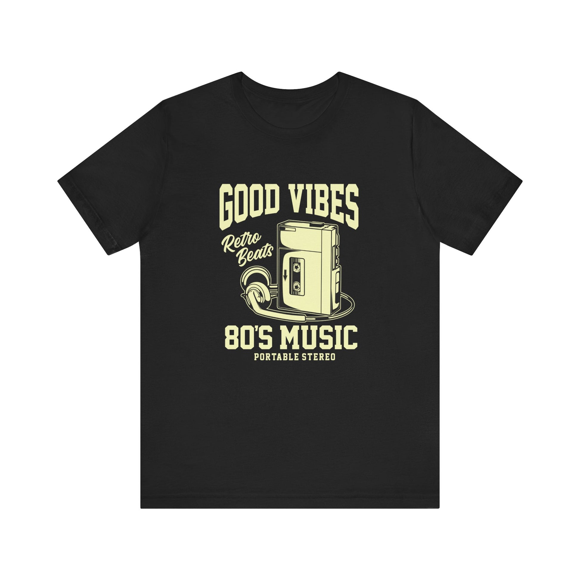 A nostalgic T-shirt featuring a vintage walkman design from the 80s, perfect for carrying good vibes and music lovers. This T-shirt is a cozy addition to any wardrobe and is ideal for casual wear. Relevant to music enthusiasts and those who appreciate retro style, suitable for birthdays, music festivals, and 80s-themed parties.